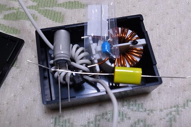 しかし・・・・そもそも今回のノイズがどのような性質のものかがわかっていないので、両方のモードに対応するフィルタを作成することに・・・・って、一緒に購入してきたケースに2つのコイルとコンデンサが全然入らないじゃん!!