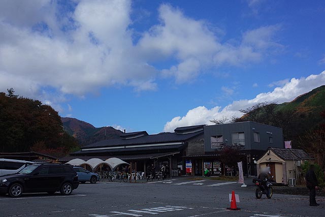 普段は空いているこの道の駅は、バイク以外にも自動車がいっぱい。みなさん紅葉を楽しみに来たみたいで、お店の人にスポットを聞き込んでいました。