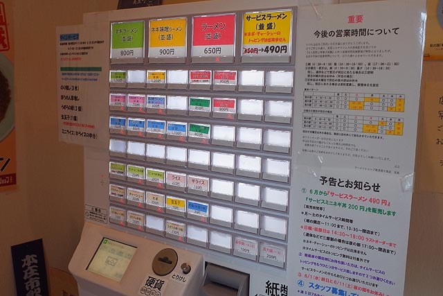 入り口に鎮座する食券機で事前精算するシステム。何やら張り紙がやたらと多いぞ!!