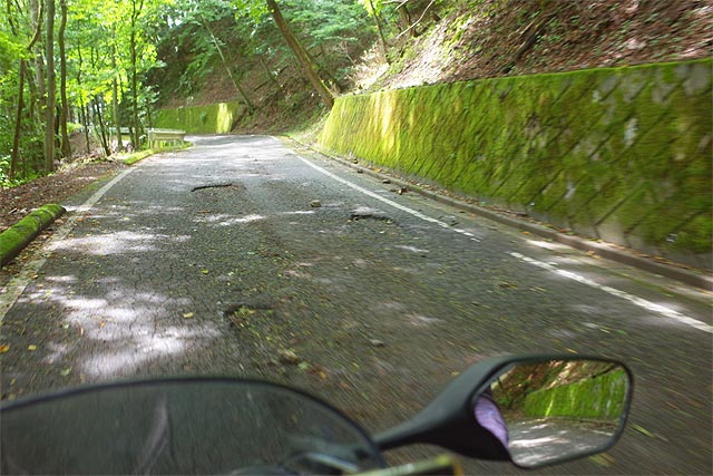 するとそこから先はかなり路面が荒れている・・・・結構ボコボコと穴が開いているので下手に突っ込むと転倒という悲劇が待ち受けます。