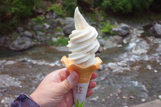 すぐ脇を流れる神流川を眺めつつ、ソフトクリーム。