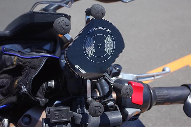 デイトナ製の薄型Qiトランスミッターをスマフォホルダーに貼り付けて運用。