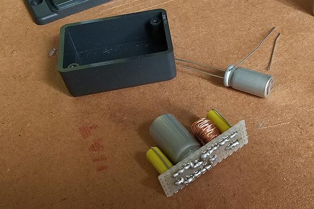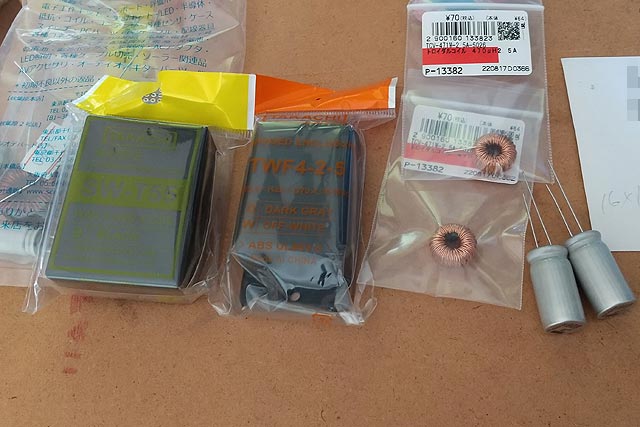9A対応のコイルから2.5A対応のコイルへダウングレードさせればなんとか入るかな? 残りの部品は自動車用途の高温対応電解コンデンサと、高いノイズ周波数帯への効果を狙ってフィルムコンデンサ。