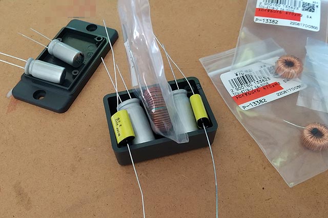 次に内蔵させる部品の選定。コンデンサやコイルはデカい方が良いがケースに収めるために物理的な制約が存在する・・・・