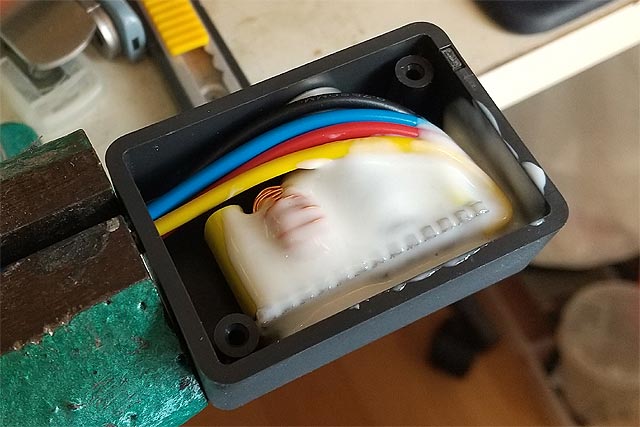 ケーブルを通す穴もしっかりと防水のために塞ぎ、蓋の周囲にも接着剤を塗布して蓋を閉じます。