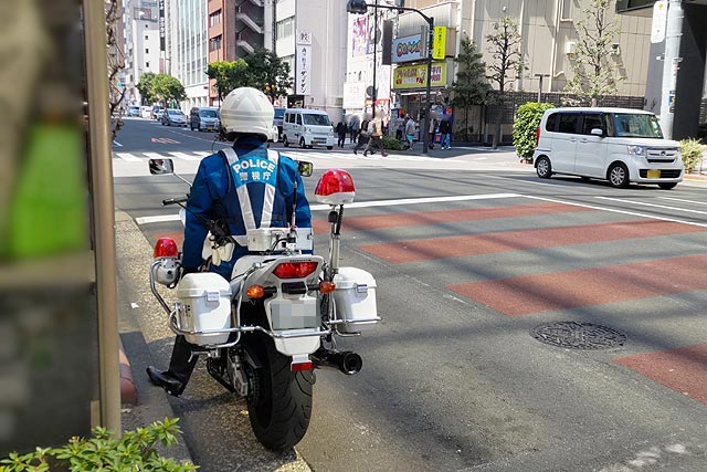 | ・姿を見せながら横断歩道歩行者妨害の取締りを実施している白バイ |