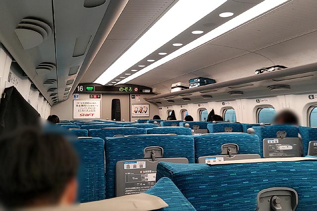 東京出発時点ではお客さんは窓側席にチラホラといった感じ。さすが300番台ののぞみ号(臨時便)をセレクトした甲斐があったわ~♪