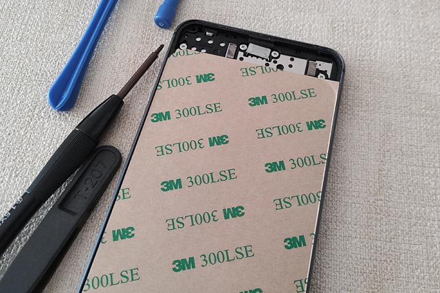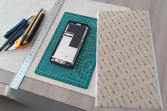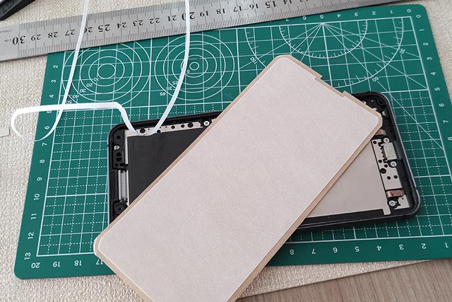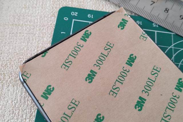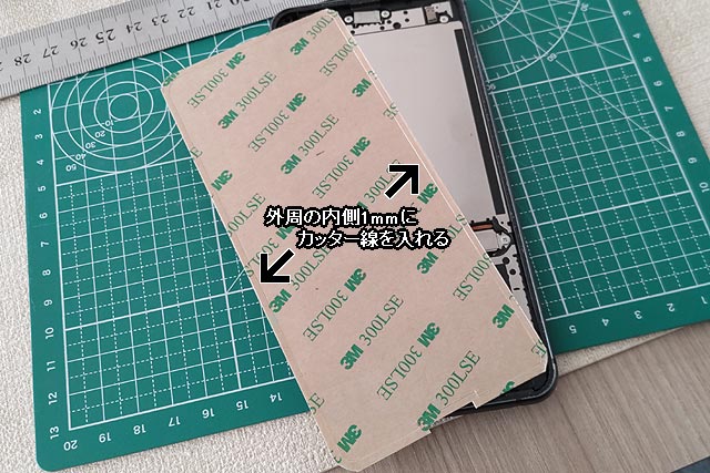 スマフォ本体側には縁に沿って約1mmの糊しろがあり、ここだけにDIYパッキンを上手いこと乗せねばならないのです。